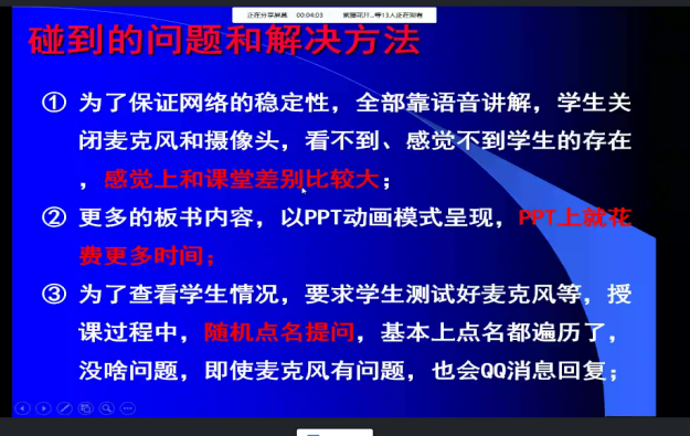 已开课专业课教师吕国云副教授针对自己在前期上课过程中遇到的各种问题及解决方法,与其他任课老师进行了毫无保留的分享。两位督导教师史浩山教授和樊养余教授也根据自己丰富的听课经验总结出线上上课的优势以及目前存在的不足,分享了自己的相关思考,同时在加强板书环节和学生互动方面对老师们提出了更高的要求。学校质量办主任肖敏老师对性爱直播