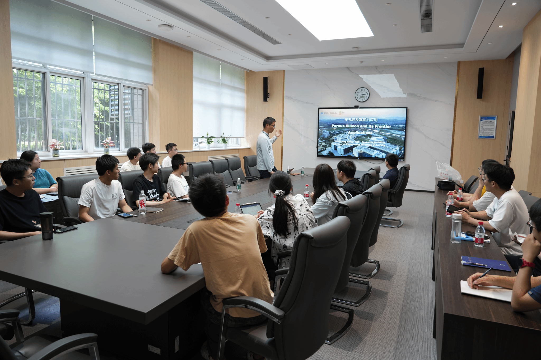 李波教授对荣国光教授的到来表示热烈欢迎,并详细介绍了荣国光教授的个人简历和研究方向。随后,荣国光教授做了题为《纳米多孔硅及其前沿应用》的专题报告。在报告开始前,荣国光教授介绍了西湖大学先进神经芯片中心概况,并欢迎各位同学去实地参观、交流、学习。随后,荣国光教授从多孔硅材料制备讲起,重点论述了多孔硅材料三个主要应用:光生物传感、电磁隐身和含能材料应用,以新冠病毒和幽门螺旋杆菌检测为例,说明了多孔硅材料在光生物传感方面的应用;在电磁隐形方面,多孔硅材料实现了对THz电磁波吸收;在含能材料方面,多孔硅表现出了优异的特性。最后荣国光教授对多孔硅材料的研究应用做了总结。
